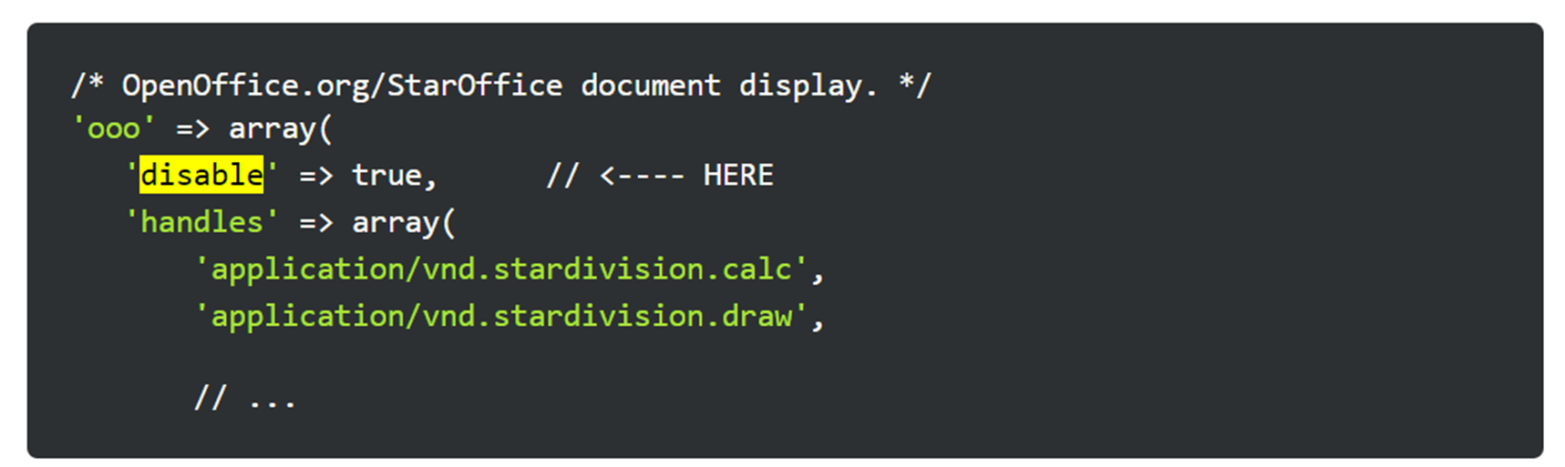 연구원은 OpenOffice 첨부 파일의 렌더링을 비활성화할 것을 권장했습니다. 관리자는 Horde 콘텐츠 루트에 있는 config/mime_drivers.php 파일을 편집해 OpenOffice mime 핸들러에 아래 구성 옵션을 추가하면 됩니다.