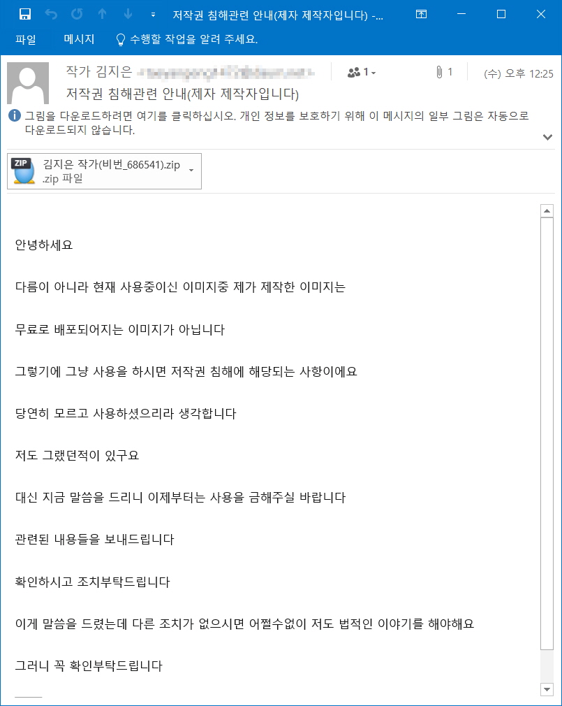 이메일은 '저작권 침해 관련 안내(제자 제작자 입니다)'라는 제목으로 유포되고 있으며, 보안 프로그램을 우회하기 위하여 비밀번호가 설정 된 압축파일이 첨부되어 있습니다.