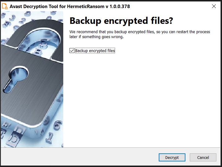 Crowdstrike의 스크립트는 믿을 만하지만, 현재 상황에서 모든 사람이 사용하기는 쉽지 않습니다. 따라서 Avast는 HermeticRansom으로 암호화된 파일을 더 쉽게 복호화 할 수 있는 GUI 암호 해독기를 공개했습니다.
