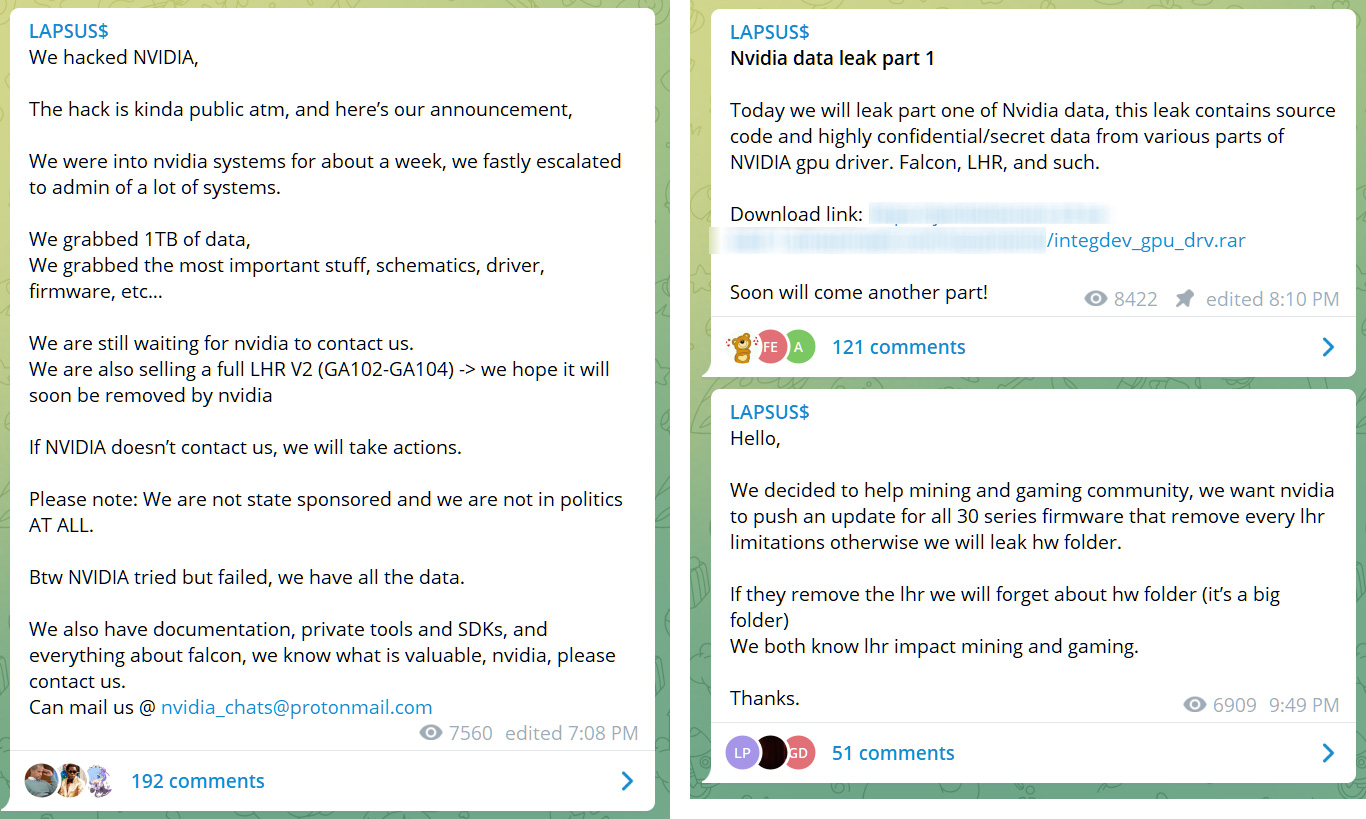 Lapsus$로 알려진 공격 그룹은 공격을 통해 데이터 1TB 상당을 훔쳤고, NVIDIA가 협상을 거절하자 온라인에 데이터를 공개하기 시작했다고 밝혔습니다.