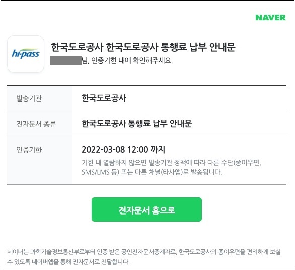 해당 피싱 메일은 '회원님께 도착한 새 전자문서를 확인하세요'라는 제목으로 유포중이며 해당 메일을 클릭하면 마치 한국도로공사에서 보낸 메일처럼 위장하고 있습니다.