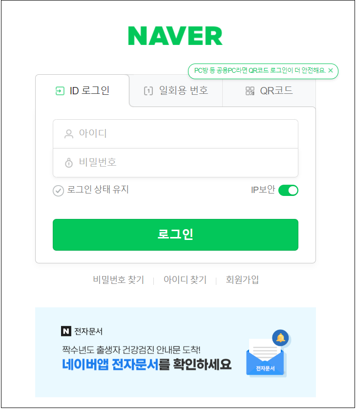만일 사용자가 전자문서 홈으로 버튼을 클릭하면 네이버를 위장한 피싱 페이지로 연결되며 사용자에게 로그인을 유도합니다.