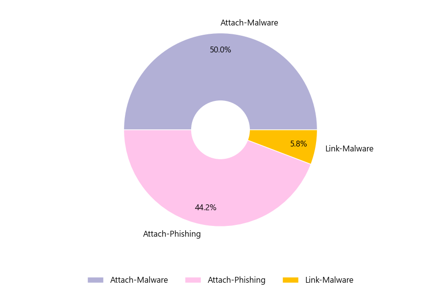 악성 이메일을 유형별로 살펴보면 190건 중 Attach-Malware형이 50.0%로 가장 많았고 뒤이어 Attach-Phishing형이 44.2%를 나타냈습니다.
