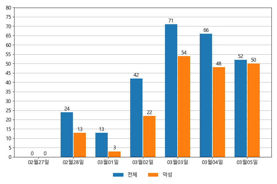 일일 유입량은 하루 최저 13건(악성 3건)에서 최대 71건(악성 54건)으로 일별 편차를 확인할 수 있습니다.