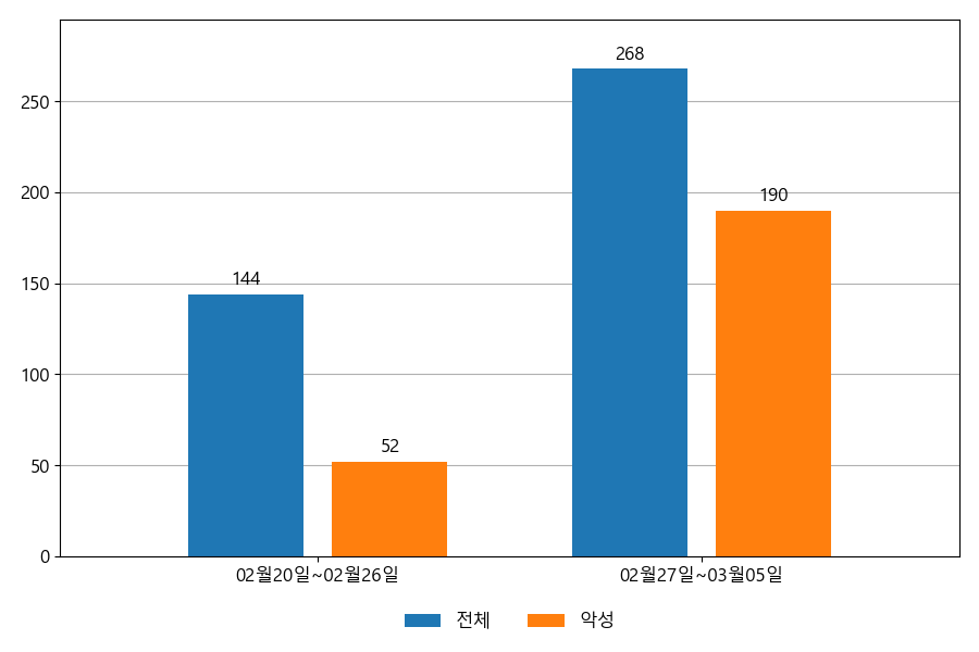 지난주 이메일 유입량은 총 268건이고 그중 악성은 190건으로 70.9%의 비율을 보였습니다. 악성 이메일의 경우 그 전주 52건 대비 190건으로 138건이 증가했습니다.