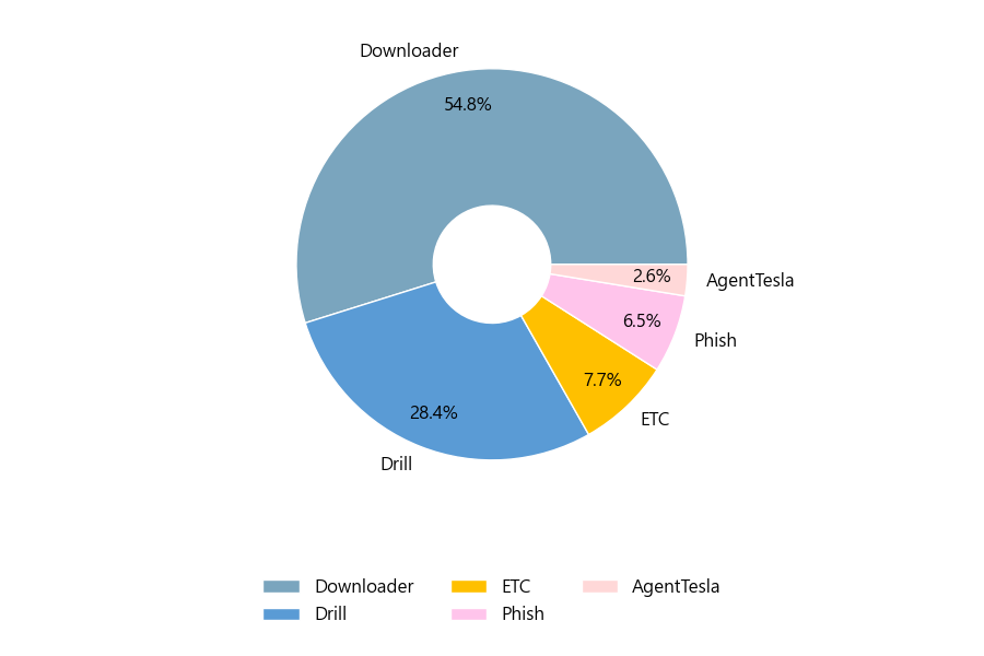 첨부파일은 ‘Downloader’형태가 54.8%로 제일 큰 비중을 차지했고 뒤이어 ‘Drill’, ‘ETC’가 각각 28.4%, 7.7%의 비중을 차지했습니다.