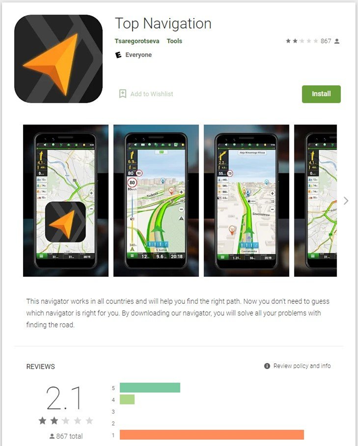 <플레이 스토어에서 여전히 다운로드 가능한 가짜 네비게이션 앱>