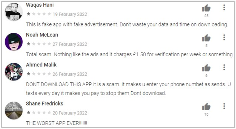해당 앱의 사용자 리뷰를 확인 결과 구독 사기와 관련된 내용이 발견되었습니다. 이들은 인증이나 광고 제거를 위해 주당 2달러를 청구하지만 약속된 기능을 제공하지 않은 것으로 나타났습니다.