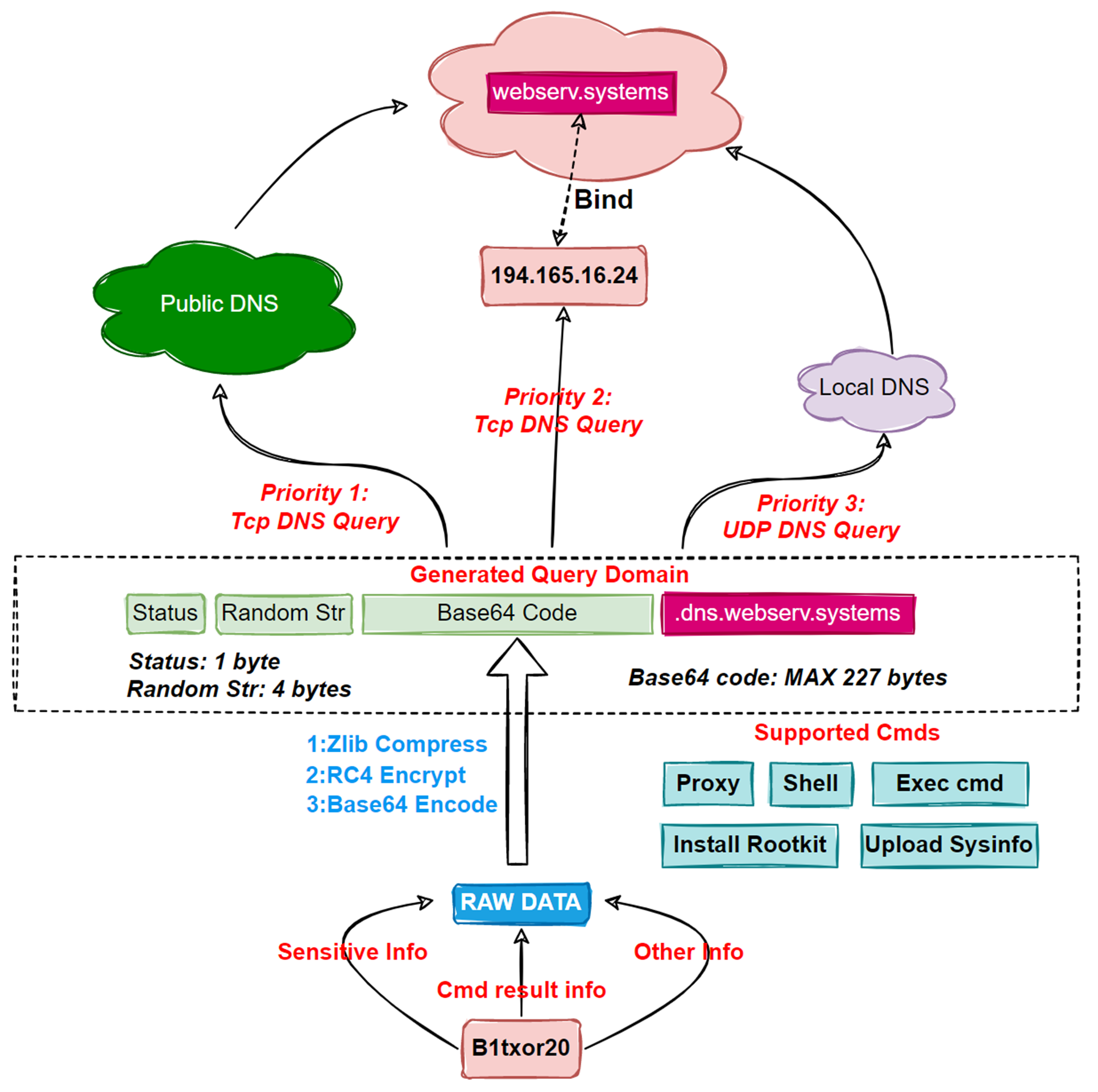 "봇은 훔친 특정 인코딩 기술을 통해 민감 정보, 명령 실행 결과, 전달해야 할 기타 정보를 숨긴 후 DNS 요청을 통해 C2에 전송합니다.”