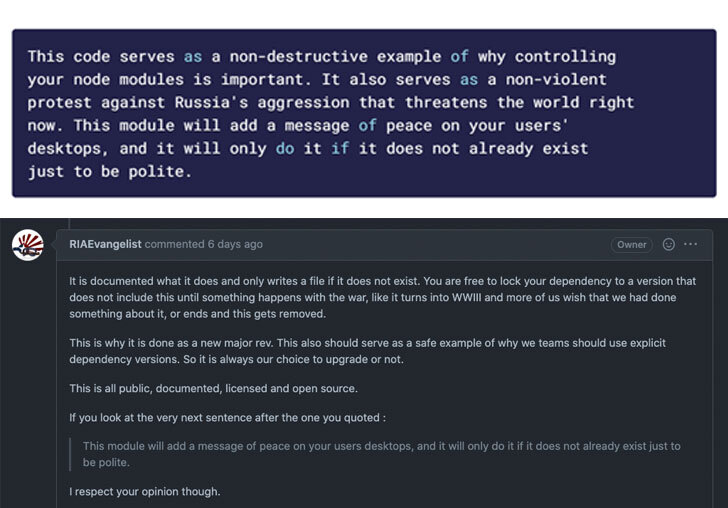 라이브러리 버전 10.1.1, 10.1.2에 영향을 미치는 이 새로운 변경은 유지 관리자인 RIAEvangelist가 사용자의 IP 주소가 러시아나 벨로루시 내에 있을 경우 임의 파일 내용을 삭제하고 이를 하트 이모티콘으로 교체합니다.