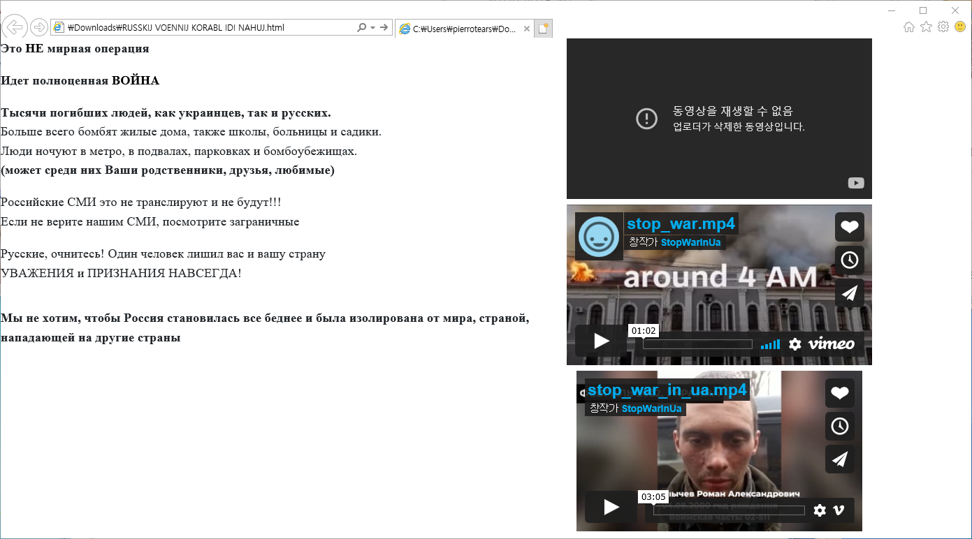 흥미로운 것은, 해당 랜섬웨어는 일반 랜섬웨어와 다르게 랜섬머니를 요구하지 않는 대신 전쟁을 멈추라는 메세지를 띄웁니다.