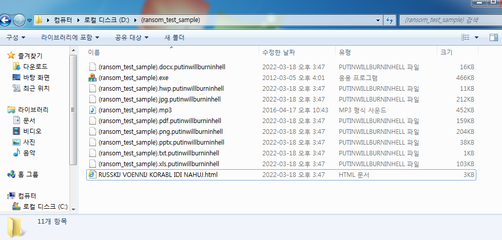 암호화 후 확장자를 ".putinwillburnunhell" 로 변경한 후 "RUSSKIJ VOENNIJ KORABL IDI NAHUJ"라는 .html 파일을 띄웁니다. 해당 문구를 번역하면 "RUSSIAN WARSHIP GO F**K"이라는 뜻입니다.