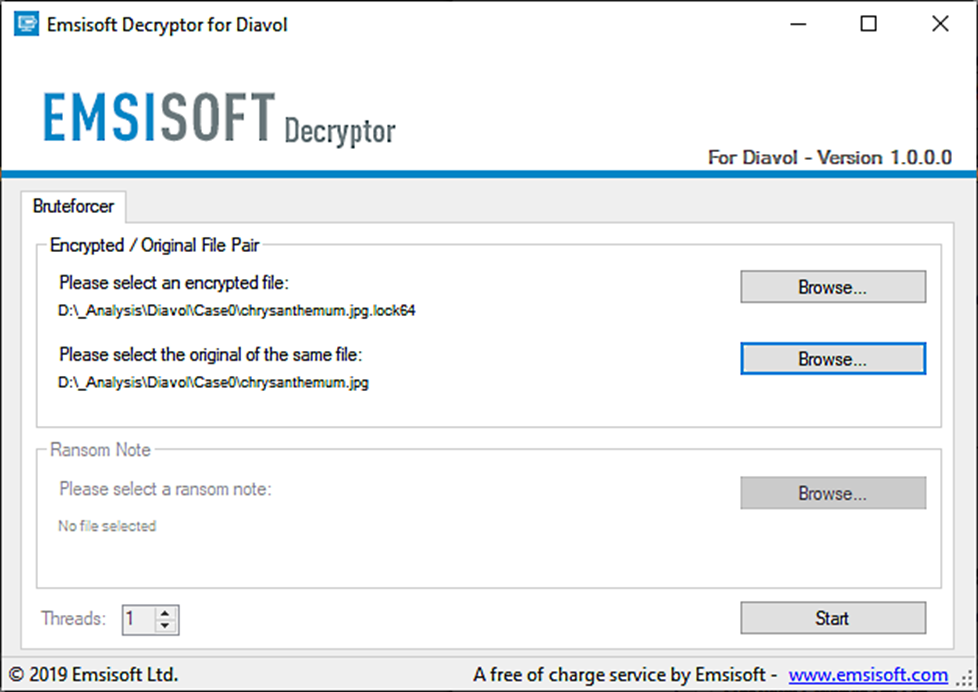Diavol 랜섬웨어의 피해자는 Emsisoft의 서버에서 무료 툴을 다운로드 후 사용 가이드[PDF]를 참고하여 데이터를 복호화할 수 있습니다.