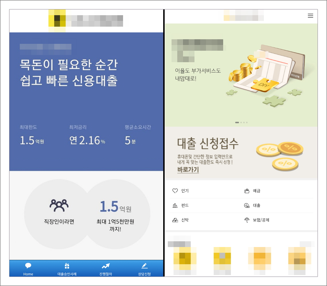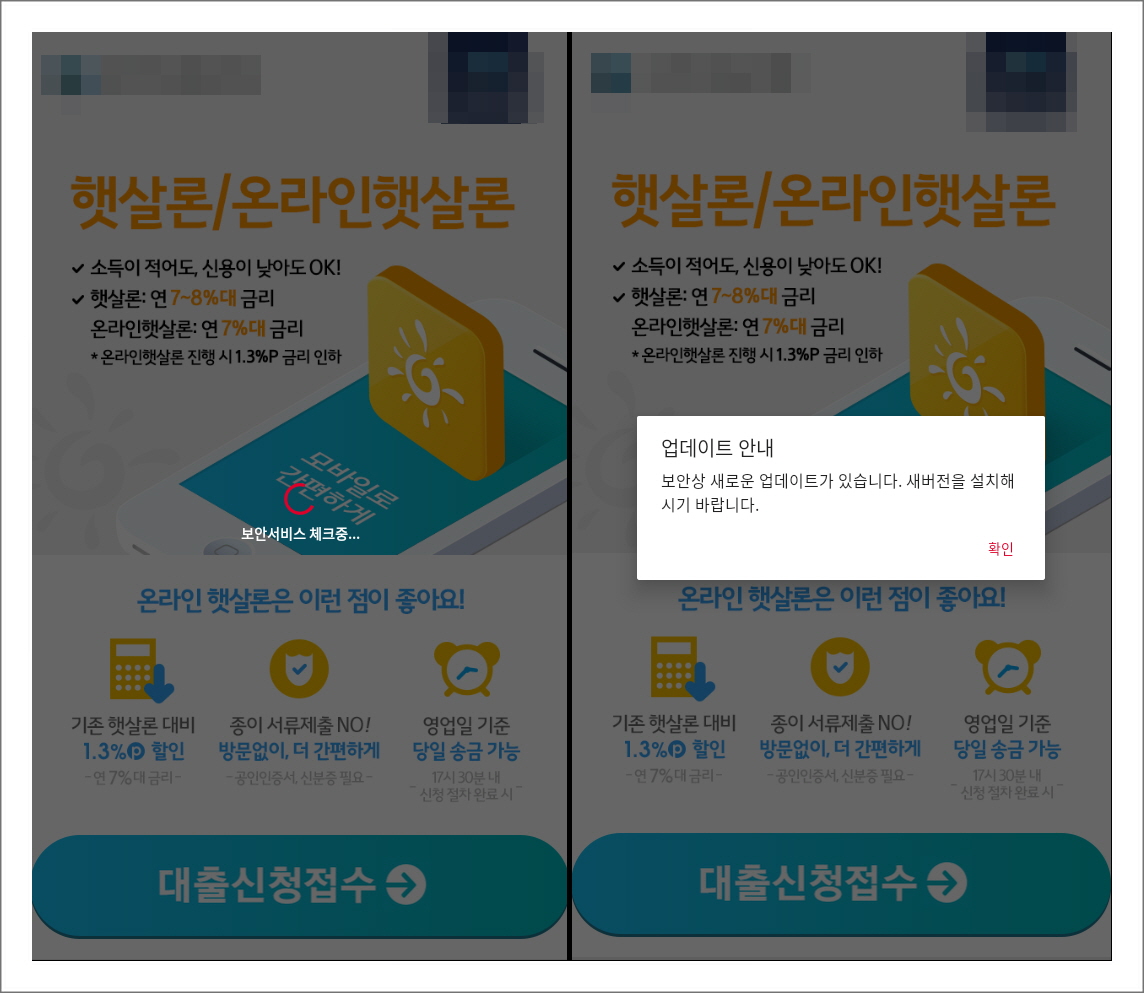 최근 앱들은 [그림 3]과 같이 대출 관련 앱으로 위장하고 있으며 보안 서비스 체크와 업데이트를 명목으로 추가 앱 설치를 유도합니다.