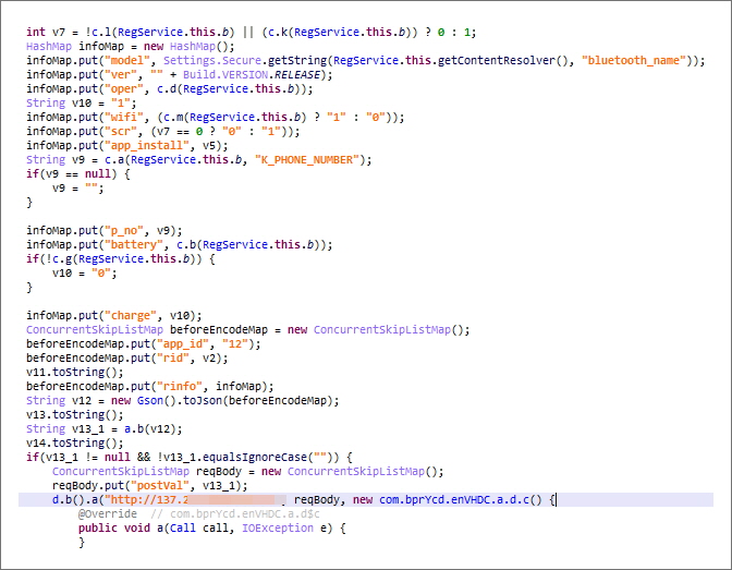 인트로 앱에서 드롭 된 dex를 분석하면 [그림 7]과 같이 기기 정보를 전송하는 것을 확인할 수 있습니다. 서버로 전송할 때 postVal에 인자 형태로 데이터를 첨부하여 전송하는데 해당 값은 “rb!nBwXv4C%Gr^84” AES 키로 암호화 되어 전송됩니다.
