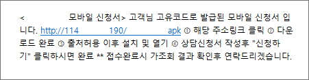 보이스 피싱의 시작은 해당 문자에 적힌 url이 있는지, 전화번호가 있는지에 따라 순서가 조금 다르지만 같은 맥락을 가지고 있습니다. url이 포함되어 있을 경우 모바일 신청서로 위장한 악성 앱을 다운로드하고 설치합니다. 전화번호만 있을 경우 해당 번호로 연락하면 모바일 신청서를 보내준다며 [그림 2]와 같은 문자를 전송해줍니다.