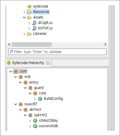 추가로 설치되는 보안 secu앱을 살펴보면 [그림 6]에서 본 것과 비슷해 보이는 클래스 목록입니다. Assets 구성이 조금 다르지만, 마찬가지로 dex 드롭을 진행하여 소스 코드를 보호하는 것을 확인할 수 있습니다.