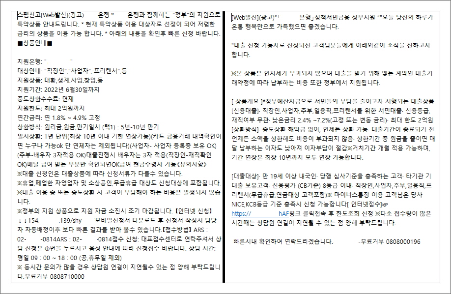 저금리를 미끼로 작성하였기 때문에 문자를 받은 사용자들은 혹할 수밖에 없으며 정부지원과 무료 거부, 평일 상담 시간 등등 실제로 기업에서 보낸 것처럼 위장하여 사용자가 알아차리기 힘듭니다.