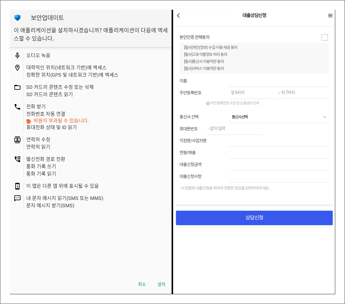 분석은 [그림 4]와 같이 추가 앱을 설치함으로 구분을 짓기 위해 대출 신청을 접수 받는 Intro앱과 실질적인 기능을 담당하는 보안 secu앱으로 호칭을 정하여 진행하였습니다.