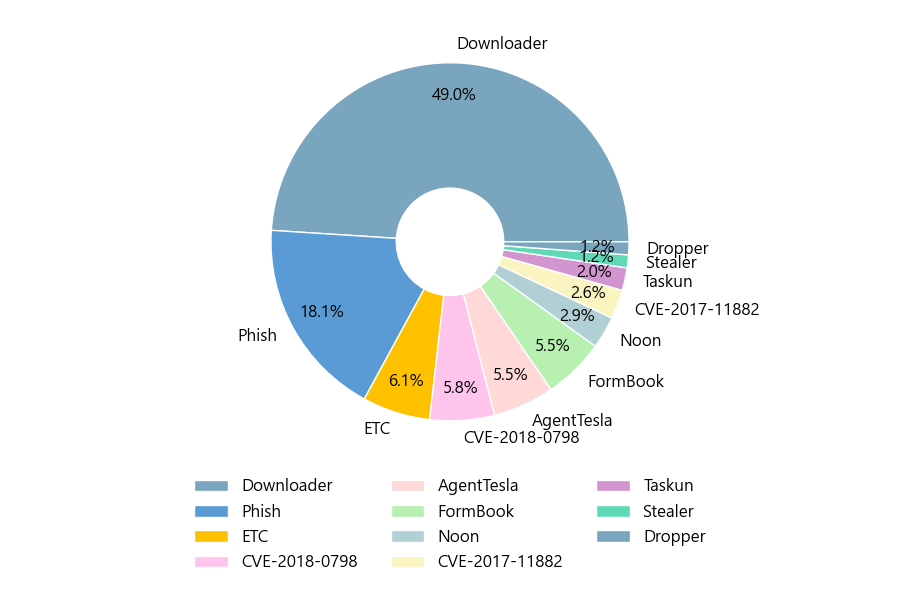 첨부파일은 ‘Downloader’형태가 49.0%로 제일 큰 비중을 차지했고 뒤이어 ‘Phish’, ‘ETC’가 각각 18.1%, 6.1%의 비중을 차지했습니다.