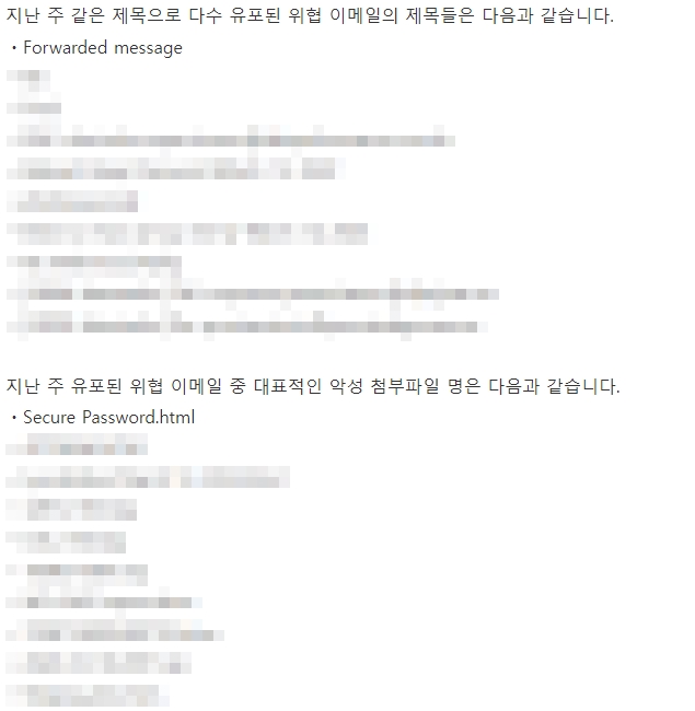 지난주 이메일 유입량은 총 152건이고 그중 악성은 65건으로 42.76%의 비율을 보였습니다. 악성 이메일의 경우 그 전주 70건 대비 65건으로 5건이 감소했습니다.