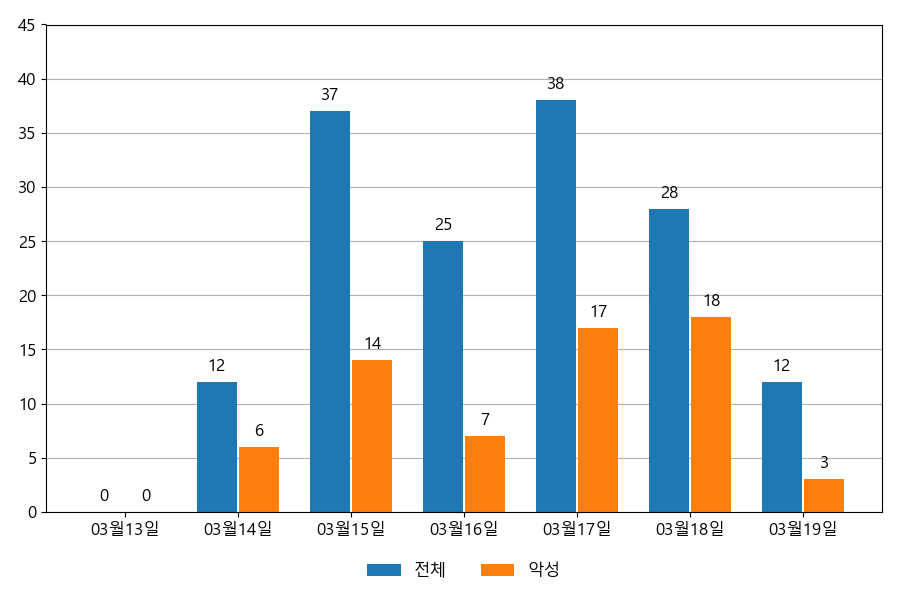 일일 유입량은 하루 최저 12건(악성 3건)에서 최대 38건(악성 18건)으로 일별 편차를 확인할 수 있습니다.