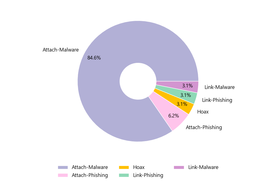 악성 이메일을 유형별로 살펴보면 65건 중 Attach-Malware형이 84.6%로 가장 많았고 뒤이어 Attach-Phishing형이 6.2%를 나타냈습니다.