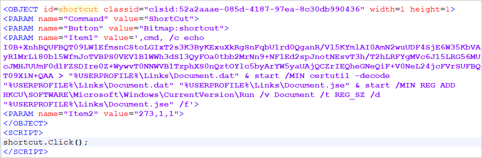 악성 명령어가 실행되면 %USERPROFILE%\Links\Document.dat, %USERPROFILE%\Links\Document.jse 파일을 생성 및 실행하며, 생성된 %USERPROFILE%\Links\Document.jse 파일은 시스템이 재부팅 시에도 자동으로 실행되기 위해 레지스트리 자동 실행(HKCU\SOFTWARE\Microsoft\Windows\CurrentVersion\Run)에 등록합니다.