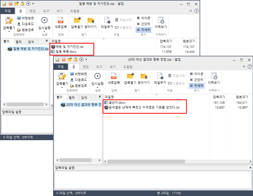 유포된 이메일은 모두 ZIP로 압축된 파일이 첨부되어 있으며, 압축 파일 내부에는 docx 문서와 rar 압축파일이 담겨 있습니다.