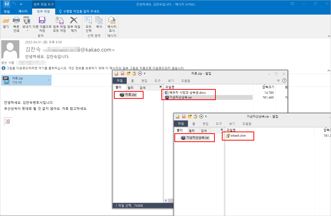 추가로 확인 된 메일은 "유산 상속" 에 관련 된 메일로 이전 형식과 동일하게 zip 파일 내부에 rar 압축파일과 docx 문서 파일이 추가 되어 있습니다.