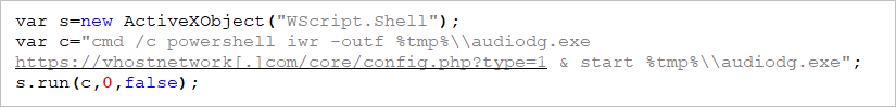 실행된 Document.jse 파일 내용은 아래와 같으며 powershell을 이용해서 c2 접속 후 파일을 다운로드 후 audiodg.exe를 실행시킵니다.