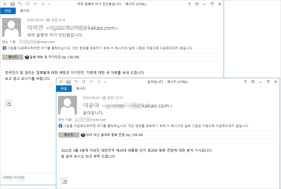이번에 발견된 메일은 "여러 질병의 자가 진단법입니다.", "윤아입니다." 의 제목으로 유포되었으며, 한국인들이 잘 걸리는 질병에 대한 예방과 자가진단, 제20대 대통령 선거 결과에 대한 내용으로 이루어져 있습니다.