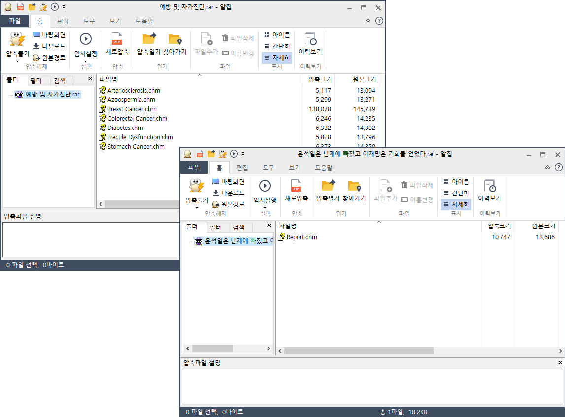 파일 내부에 존재하는 docx 파일들은 모두 정상적인 파일들이며, rar 압축파일 내부에 악성 윈도우 도움말(chm)이 들어있습니다.