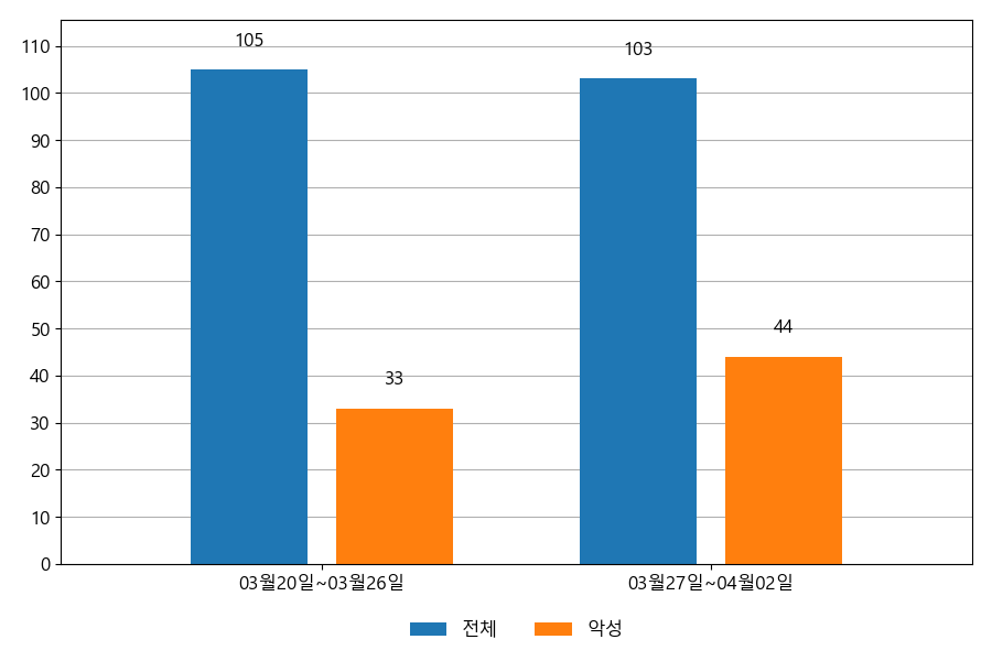 지난주 이메일 유입량은 총 103건이고 그중 악성은 44건으로 42.72%의 비율을 보였습니다. 악성 이메일의 경우 그 전주 33건 대비 44건으로 11건이 증가했습니다.