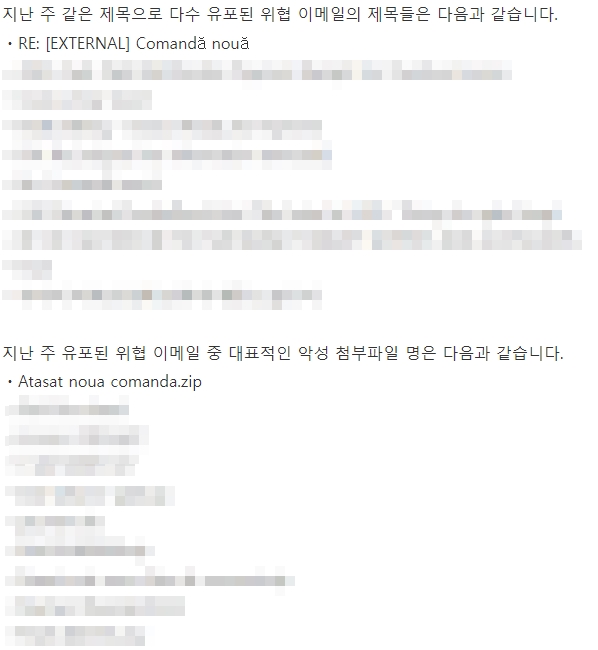 이번주 Pick으로는 지난번에 이어 꾸준히 발견되고 있는 악성 이메일을 선정했습니다. 이번에도 특정 자료들을 보냈다는 극히 단순한 내용만을 본문에 포함하고 있습니다. 확인하는 사람 입장에서 보면 꼭 봐야한다는 다소 억지스로운 내용보다 이런 단순한 내용이 오히려 의심을 줄이고 호기심을 유발하기도 합니다. 악성 행위에 대한 자세한 내용은 다음 글을 확인하시기 바랍니다.