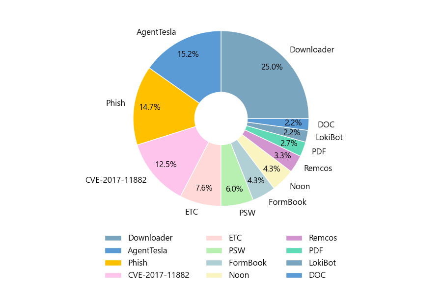 첨부파일은 ‘Downloader’형태가 25.0%로 제일 큰 비중을 차지했고 뒤이어 ‘AgentTesla’, ‘Phish’가 각각 15.2%, 14.7%의 비중을 차지했습니다.