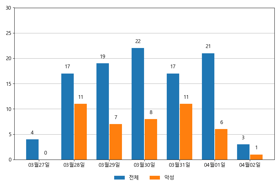 일일 유입량은 하루 최저 3건(악성 1건)에서 최대 22건(악성 11건)으로 일별 편차를 확인할 수 있습니다.