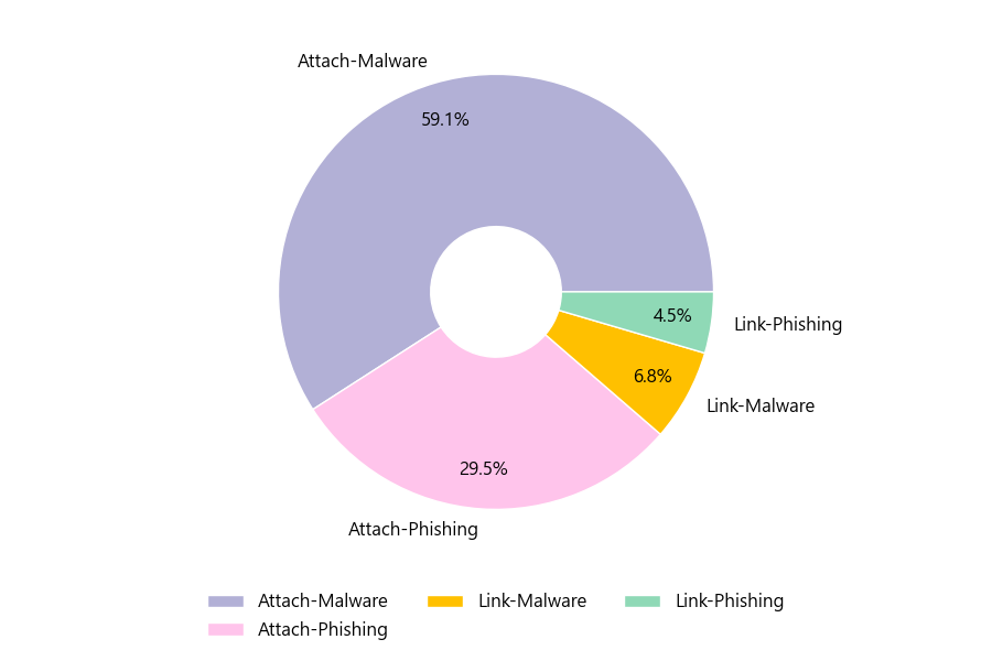 악성 이메일을 유형별로 살펴보면 44건 중 Attach-Malware형이 59.1%로 가장 많았고 뒤이어 Attach-Phishing형이 29.5%를 나타냈습니다.