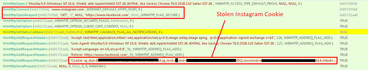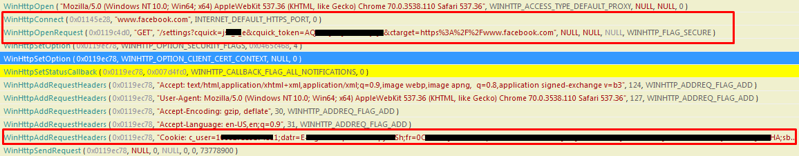 <IE에서 Facebook 쿠키를 훔치는 악성코드 기능>