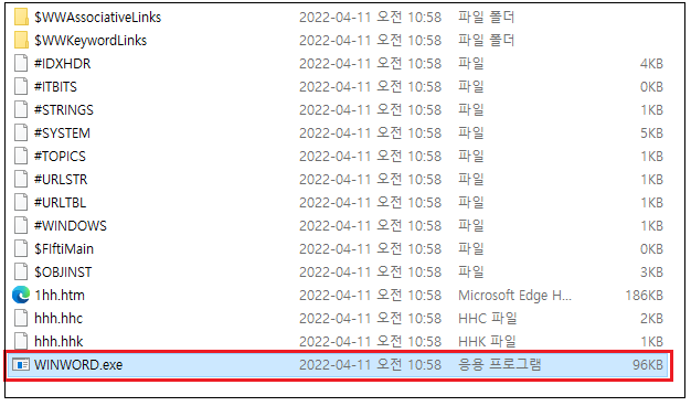 .chm 파일을 실행하면, 내부에 있는 악성 WINWORD.exe 파일이 실행되며 추가로 FeedsBroker.exe 파일을 실행합니다.