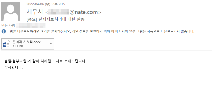 상기 이메일과 첨부파일을 확인할 경우 주의가 필요합니다.