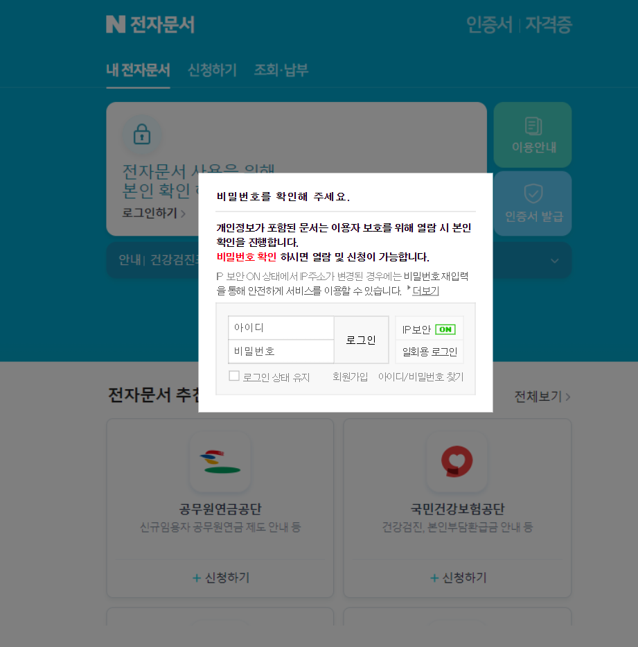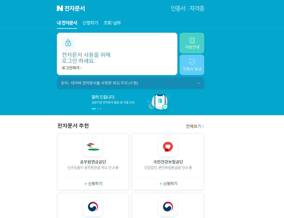 만일 사용자가 피싱 메일에 있는 [확인하기] 혹은 [전자문서 홈으로] 버튼을 클릭하면 네이버 전자문서 페이지를 위장한 피싱 페이지로 이동합니다.