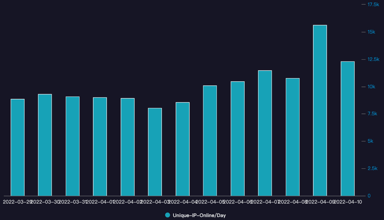 봇넷에 연결된 고유한 IP 주소의 수도 변동되었습니다. 360 Netlab에 따르면, 이들은 매일 중국 IP 주소를 사용하는 기기 1만대로 이루어진 강력한 Fodcha 봇 군대를 추적하고 있으며, 대부분이 China Unicom (59.9%), China Telecom (39.4%) 서비스를 사용하고 있었습니다.