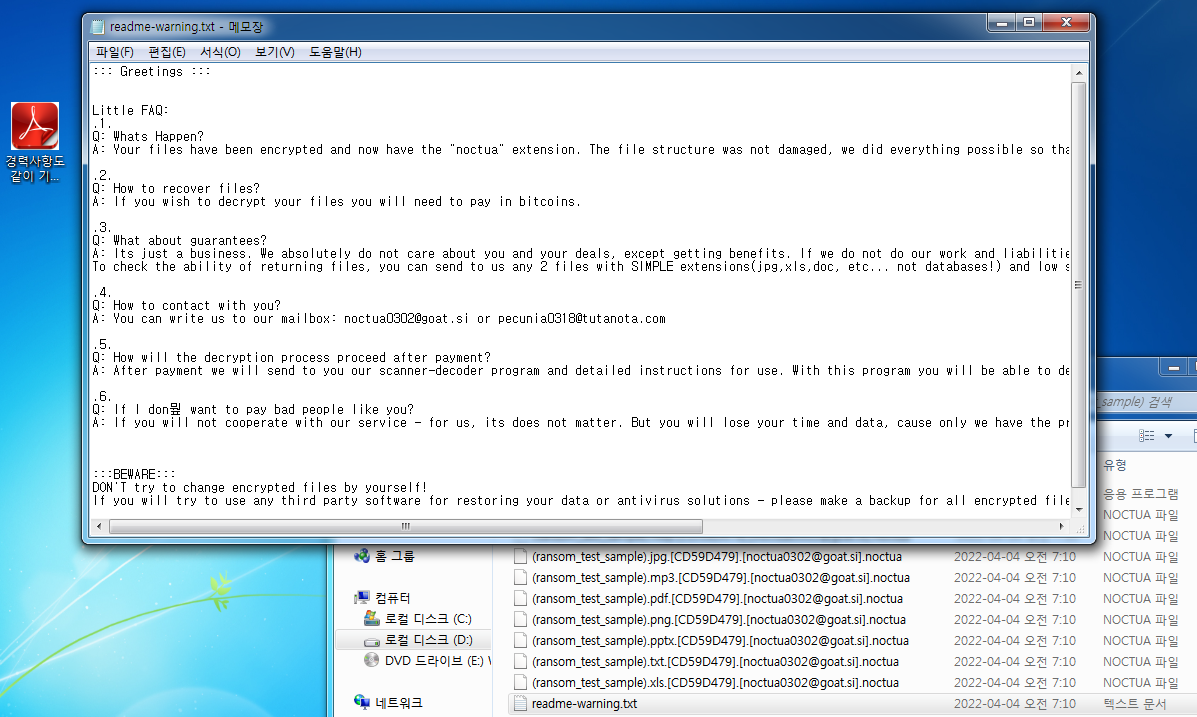 현재 유포되고 있는 랜섬웨어는 Makop 랜섬웨어로, 실행 후에는 사용자 파일 암호화 후 확장자명을 .noctua로 변경하며 랜섬머니를 요구합니다.