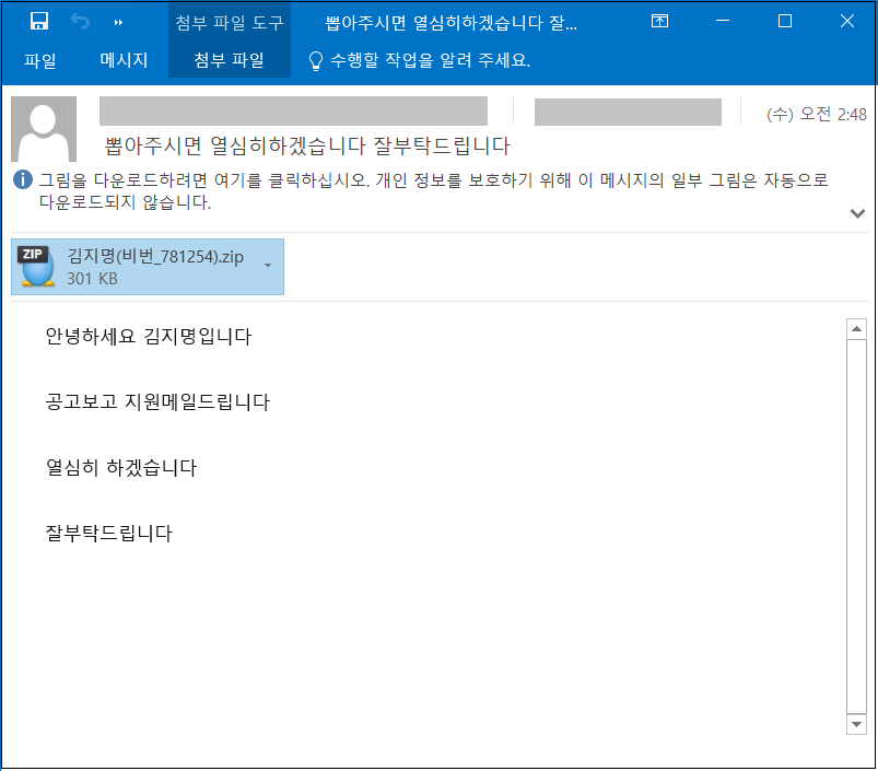 지금 대량으로 유포중인 피싱 메일 역시 이력서, 저작권 침해 내용을 위장하고 있으며, 피싱 메일 내부에는 악성 파일이 첨부되어 있습니다.