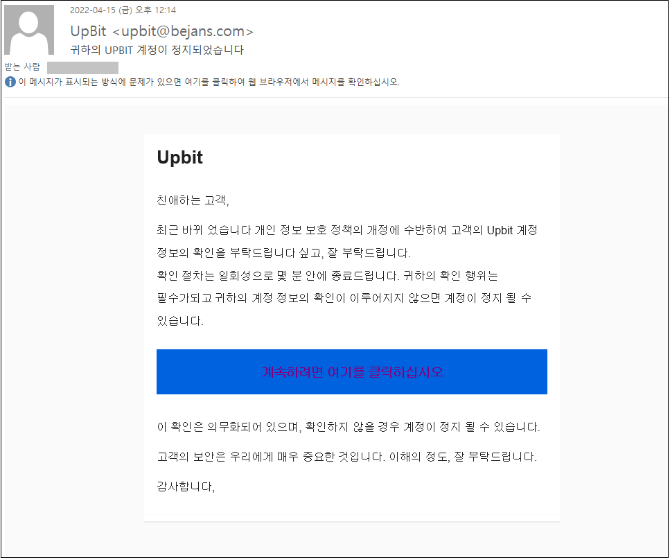 금일 발견된 이메일은 코인 거래소 업비트를 사칭하고 있으며, "귀하의 UPBIT 계정이 정지되었습니다."라는 제목으로 유포중에 있습니다.