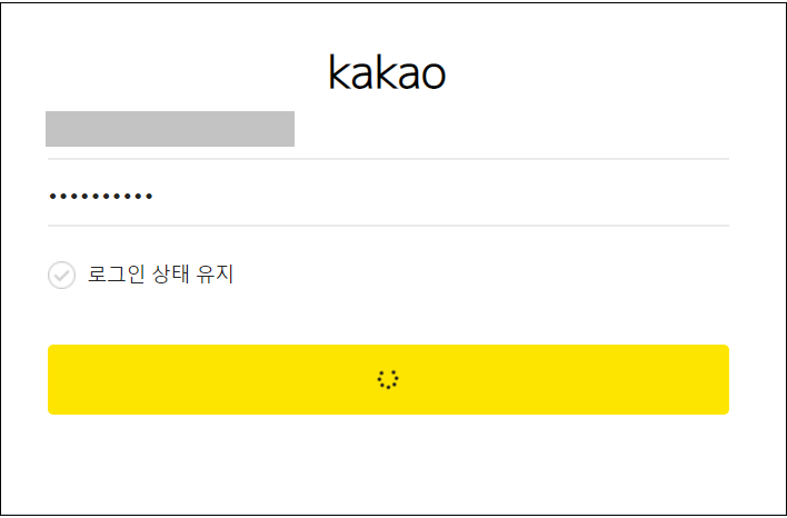 사용자가 카카오계정으로 로그인 버튼을 클릭하면 실제 페이지와 유사하게 제작된 로그인 피싱 페이지로 이동하며, 사용자가 계정정보를 입력하면 다음과 같이 오랜 시간동안 로딩중으로 뜹니다.