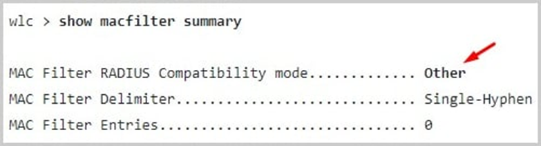 첫 번째는 "config macfilter radius-compat cisco" 명령을 통해 "macfilter radius compatibility" 모드를 기본값으로 재설정하는 것입니다.